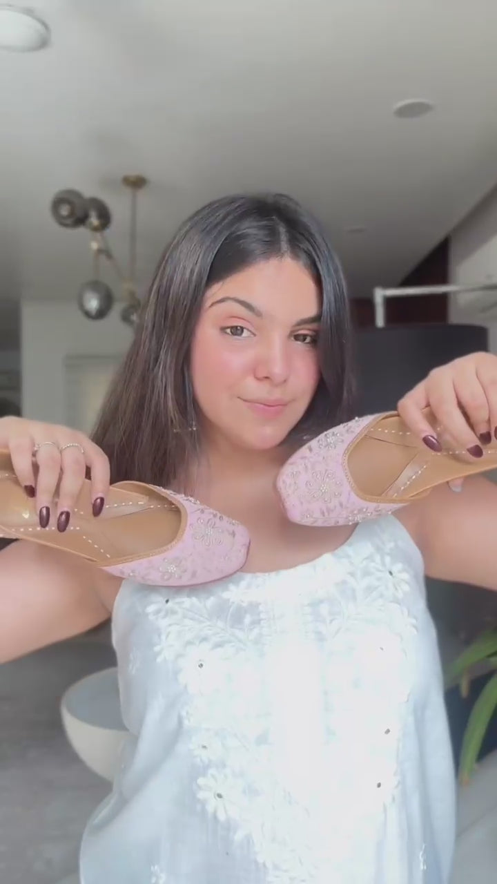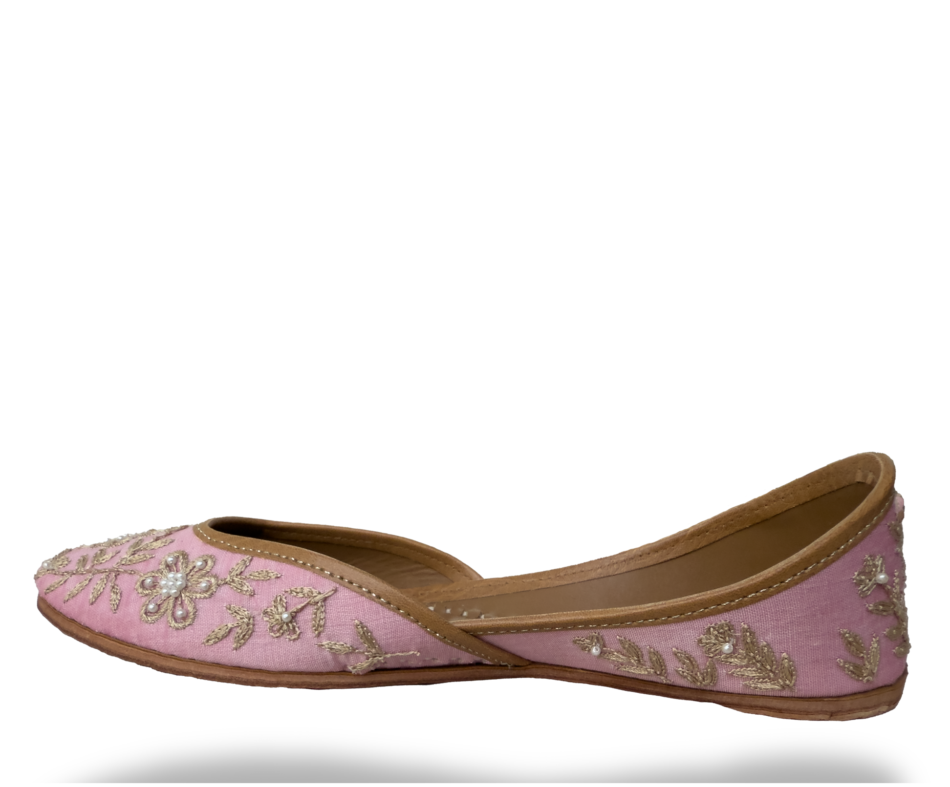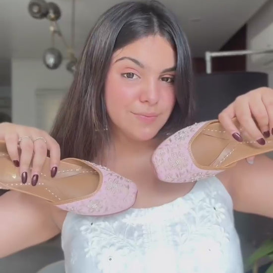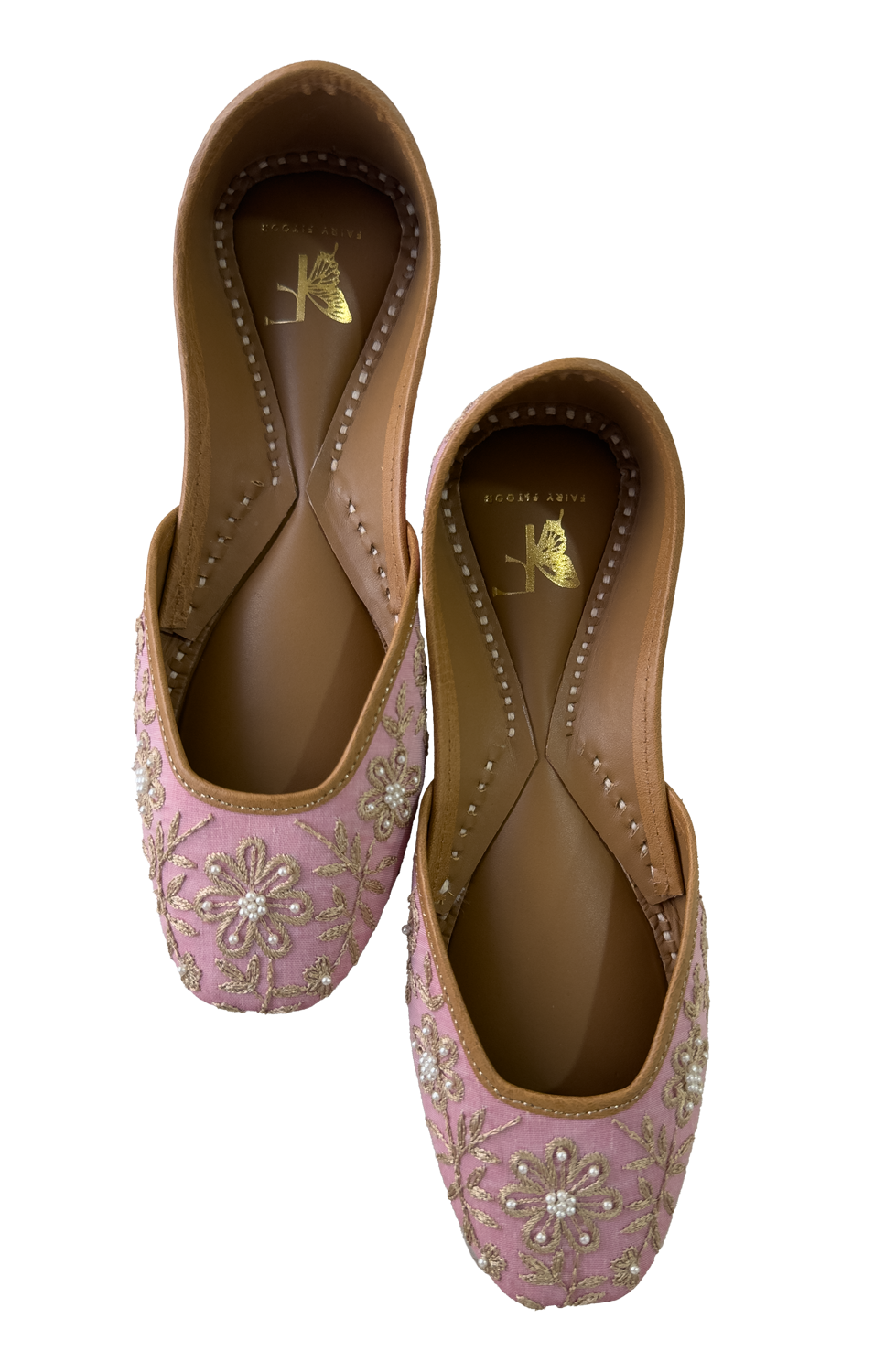 Blush Bloom is a handcrafted pink floral jutti adorned with beads and golden embroidery. Perfect for weddings, festive wear, and elegant ethnic styling. A signature piece from Fairy Fitoor that blends comfort with bridal ethnic charm.