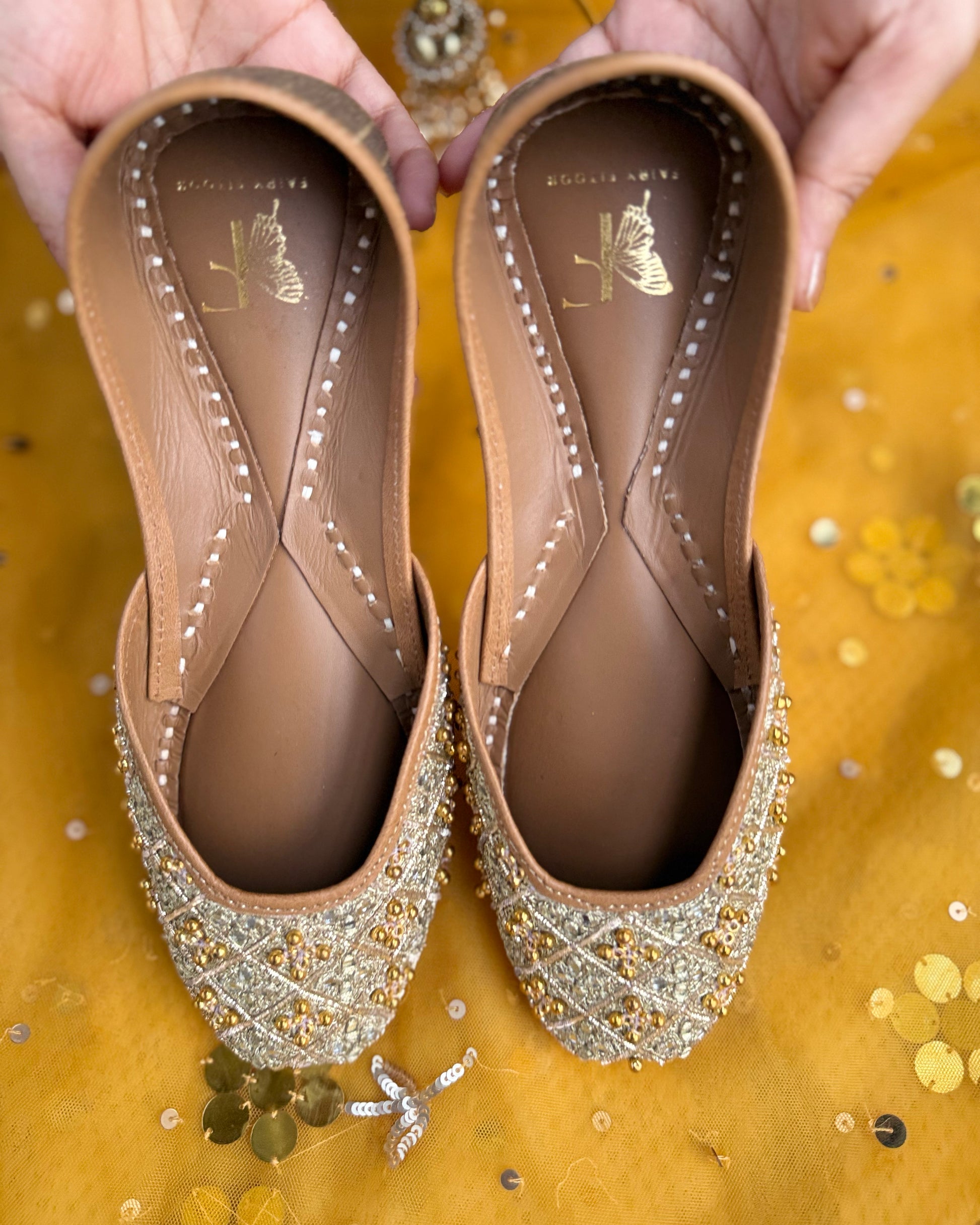 Upper: Adorned with ghungroos, mirrors, and intricate zari work for that extra golden shine, crafted on a luxurious silk base for a rich festive appeal.