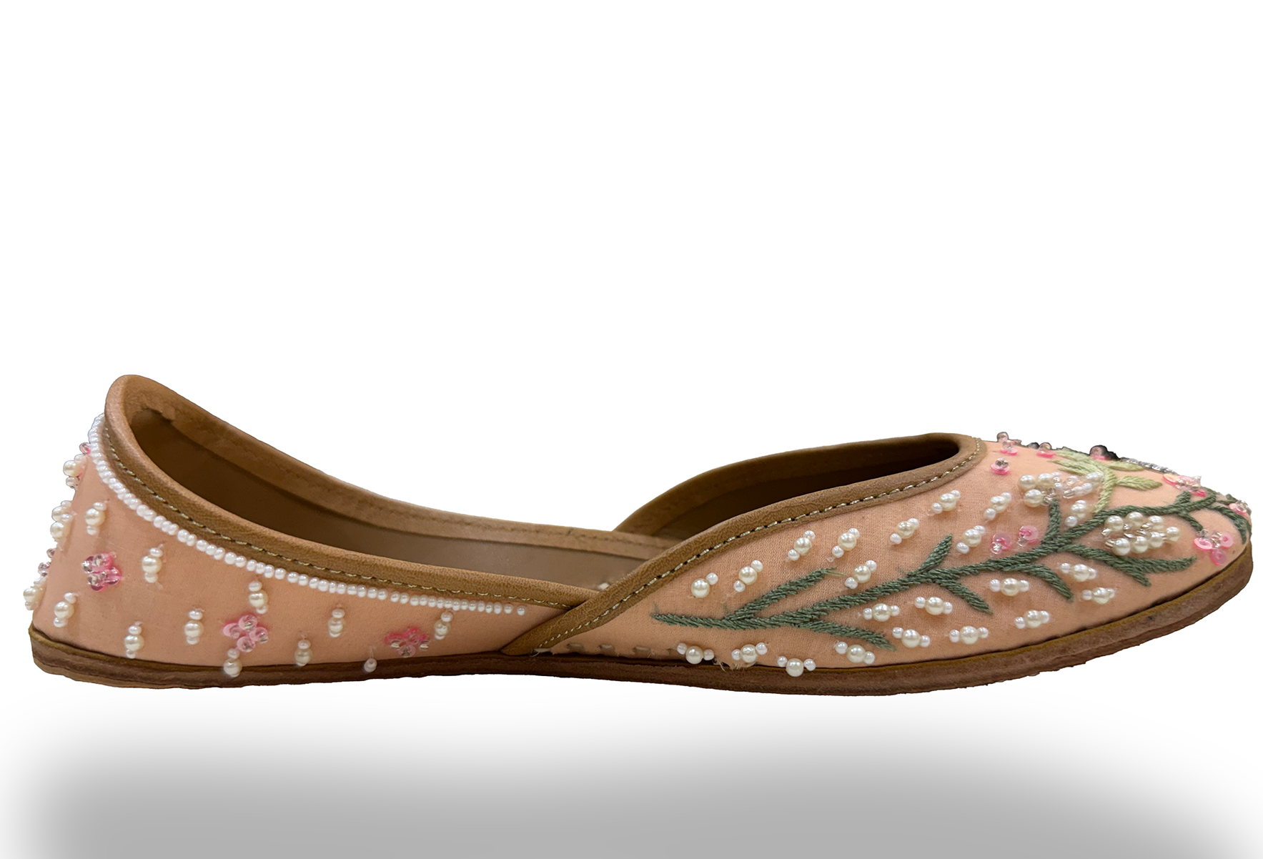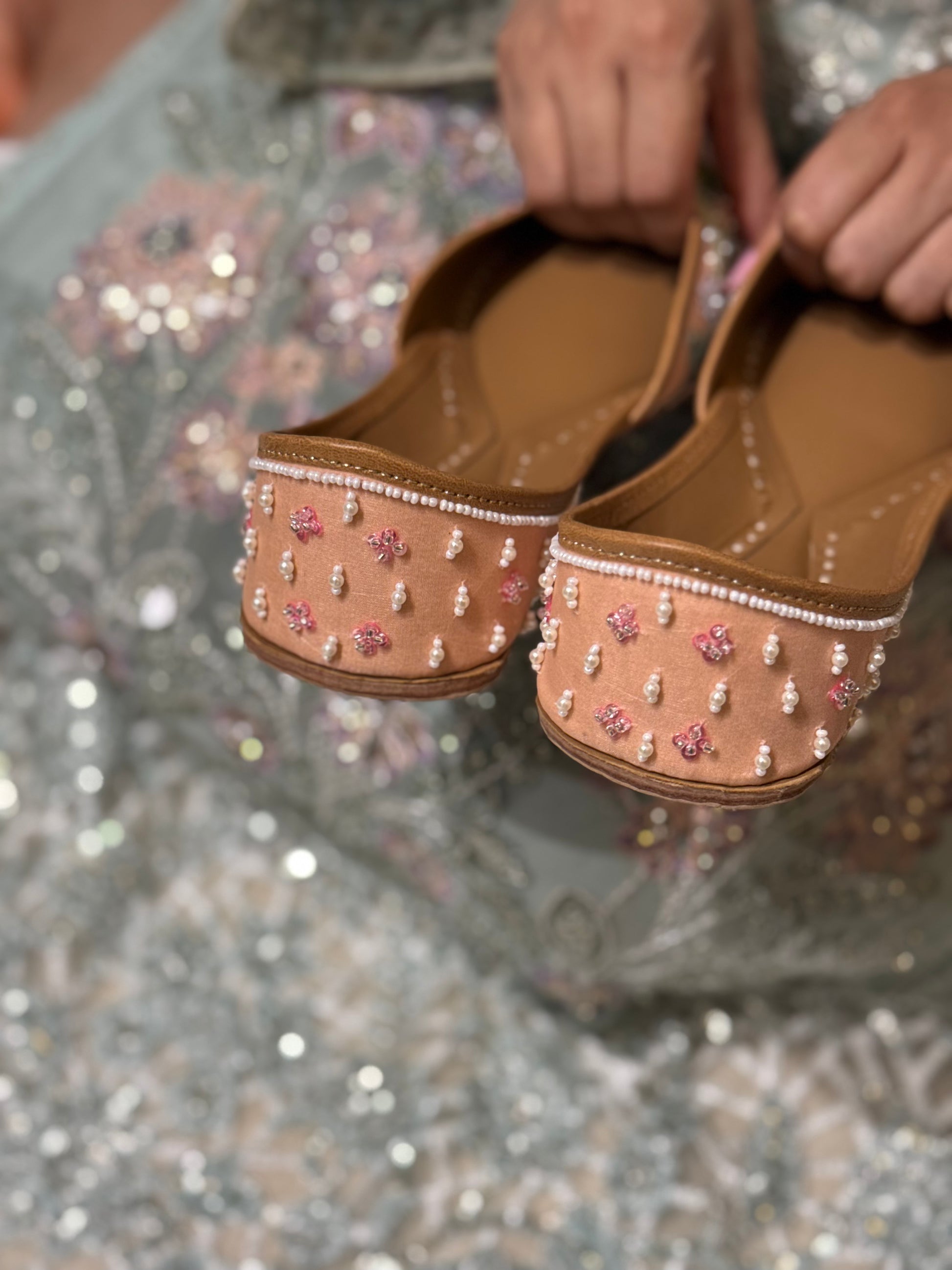 Upper: Silk threadwork embellished with sequins, cut dana, and beads, set on a double-layer base of luxurious peach silk satin and sheer organza for a soft, refined feel.