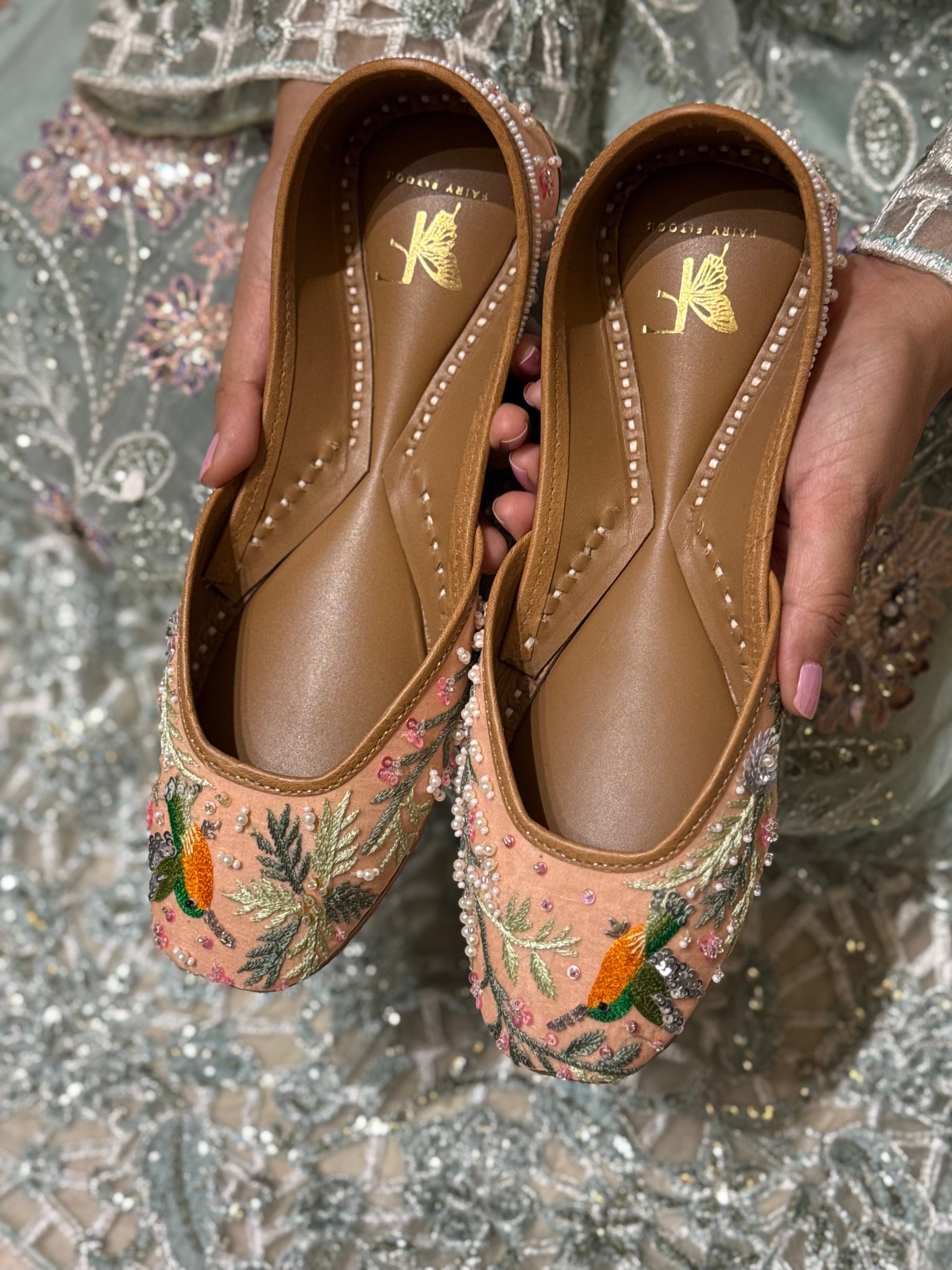 A poetic blend of rain-kissed charm and artisanal grace. Rimjhim Affair features delicate embroidery of a vibrant hummingbird amidst lush florals, brought to life with sequins, pearls, and soft pastel threads. Handcrafted to perfection, this jutti captures the beauty of a monsoon moment — cozy, romantic, and endlessly graceful. Perfect for festive wear, brunch dates, or simply celebrating yourself.