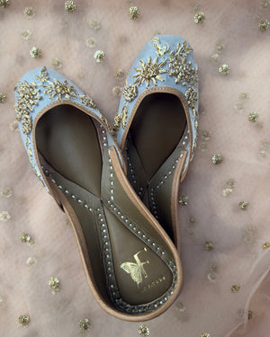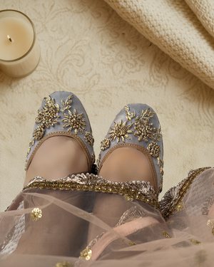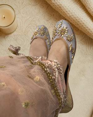 Upper: Sheer jutti crafted with fine gotta patti embroidery and delicate detailing that reflects golden tones on a soft, translucent base.
